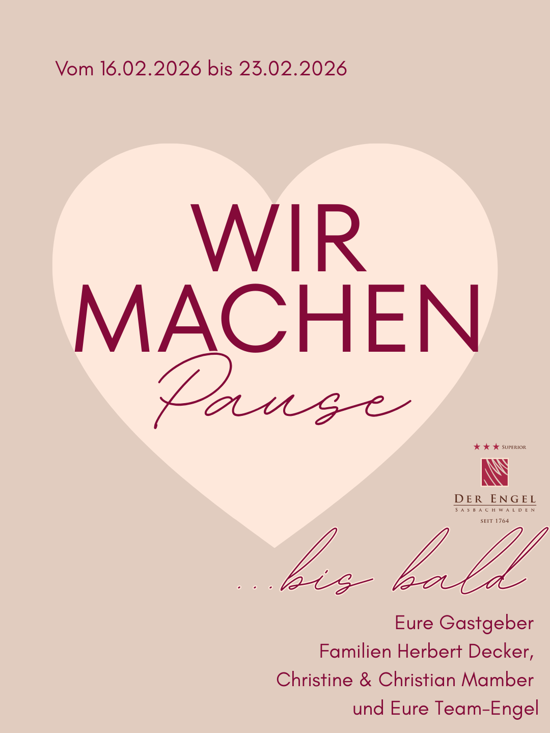 Vom 16.02.2026 bis einschließlich 23.02.2026 bleibt „Der Engel“ geschlossen.